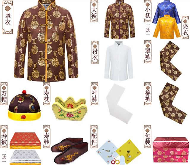 寿衣,也称“殓衣、老衣”。做寿衣的料子,一般是棉的或绸子的。有洋字的不用。因为“阳”同音,寿衣要穿到阴间去,所以不用。